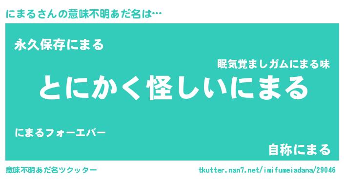 | 女子向けラノベタイトル風あだ名 | 『にまるの卵を拾いまして』 |