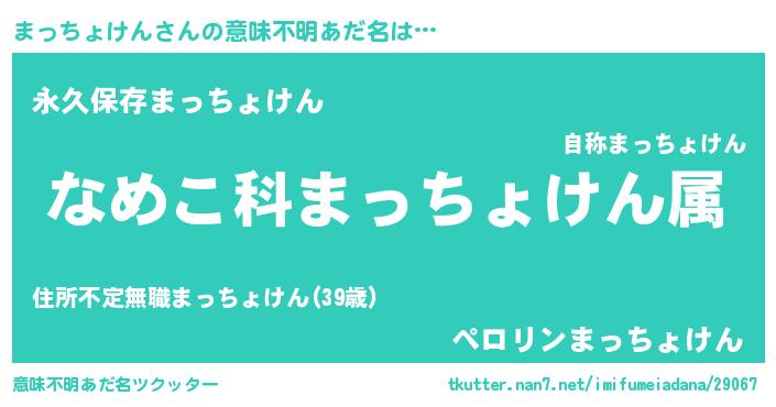 | 男性向けラノベタイトル風あだ名 | 『転生したらまっちょけんだった件』 |