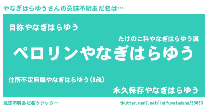 | 男性向けラノベタイトル風あだ名 | 『やなぎはらゆうに滅ぼされるだけの簡単なお仕事です』 |