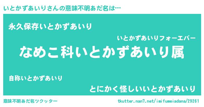 | 胡散臭い通販商品みたいなあだ名 | 『来世でも幸せになれる健康食品…その名も「いとかずあいり」』 |