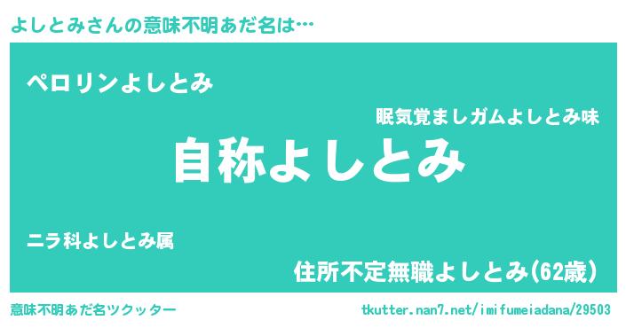 | 男性向けラノベタイトル風あだ名 | 『うちのよしとみが世界を掌握している!』 |