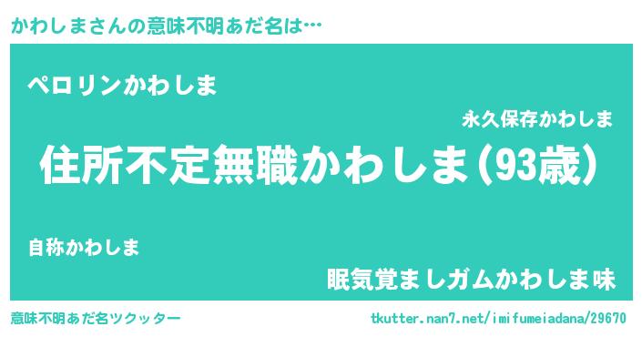 | 男性向けラノベタイトル風あだ名 | 『魔弾の王とかわしま』『かわしまの憂鬱』 |