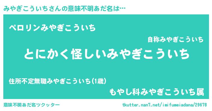 | 男性向けラノベタイトル風あだ名 | 『みやぎこういちの嫁は女の子じゃないと思った?』 |