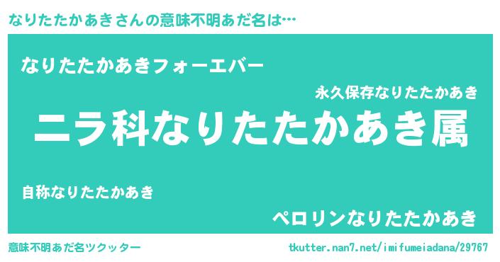 | 男性向けラノベタイトル風あだ名 | 『なりたたかあき~年齢イコール彼女いない歴の魔法使い~』 |