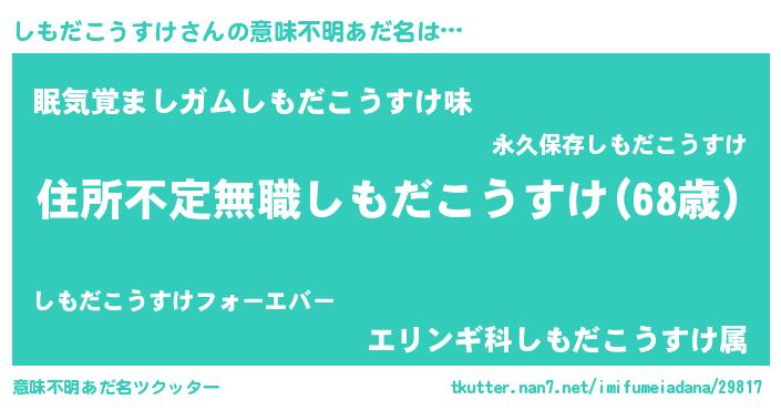 | 男性向けラノベタイトル風あだ名 | 『しもだこうすけに滅ぼされるだけの簡単なお仕事です』 |