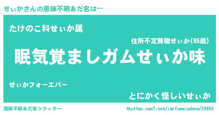 | 欧米人風あだ名 | 『ダニエルせぃか』『トリンドルせぃか』 |