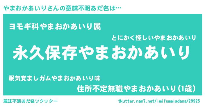 | 胡散臭い通販商品みたいなあだ名 | 『来世でも幸せになれる水素水…その名も「やまおかあいり」』 |