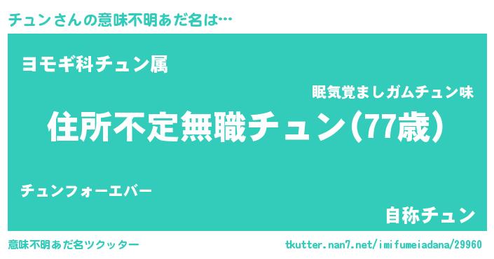 | 男性向けラノベタイトル風あだ名 | 『この素晴らしい世界にチュンを!』 |
