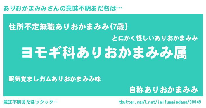 | 男性向けラノベタイトル風あだ名 | 『ありおかまみみに滅ぼされるだけの簡単なお仕事です』 |