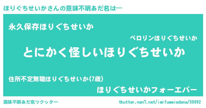 | 男性向けラノベタイトル風あだ名 | 『ほりぐちせいかの嫁は女の子じゃないと思った?』 |