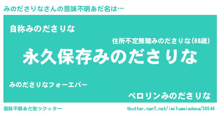 | 女子向けラノベタイトル風あだ名 | 『異世界で失敗しない100のみのださりな』 |