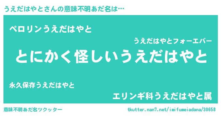 | 男性向けラノベタイトル風あだ名 | 『うえだはやとの嫁は女の子じゃないと思った?』 |
