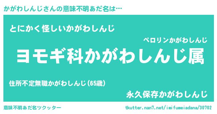 | 男性向けラノベタイトル風あだ名 | 『かがわしんじ~年齢イコール彼女いない歴の魔法使い~』 |