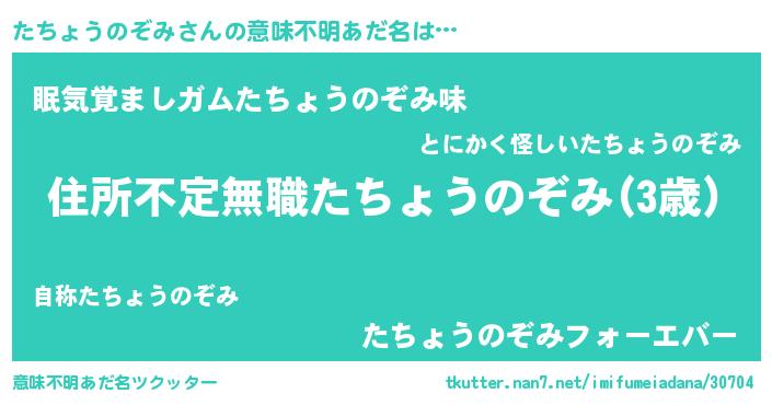 | 男性向けラノベタイトル風あだ名 | 『うちのたちょうのぞみが世界を掌握している!』 |