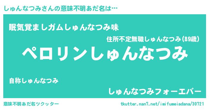| 男性向けラノベタイトル風あだ名 | 『シュンナツミアートオンライン』 |