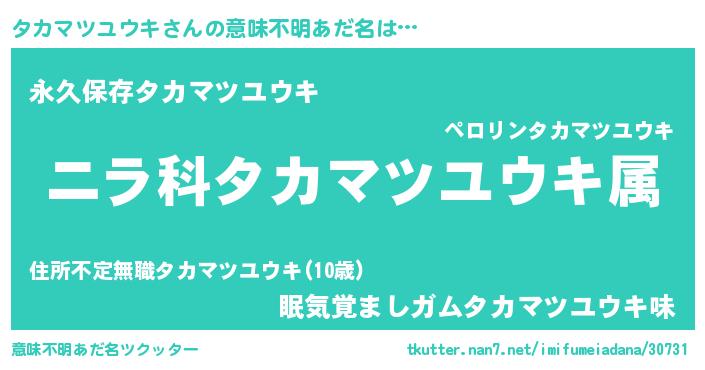 | 男性向けラノベタイトル風あだ名 | 『タカマツユウキ~年齢イコール彼女いない歴の魔法使い~』 |