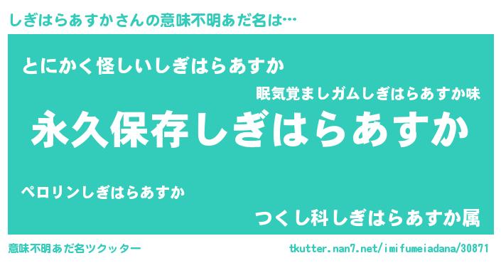 | 女子向けラノベタイトル風あだ名 | 『しぎはらあすかの契約王妃』 |