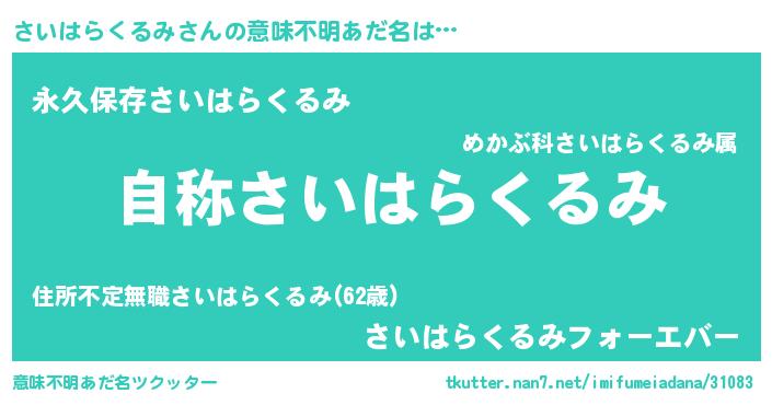 | 男性向けラノベタイトル風あだ名 | 『Re:さいはらくるみから始める異世界生活』 |