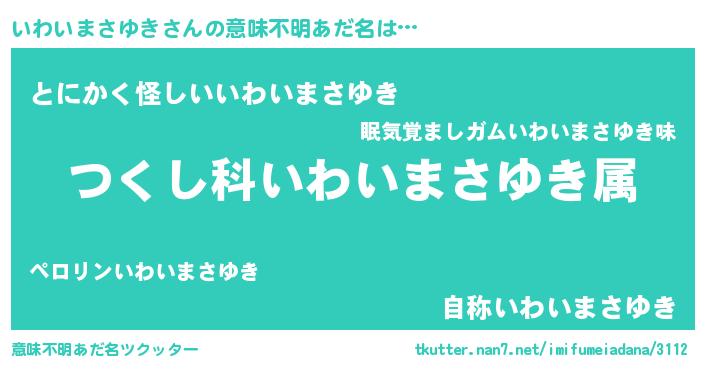 | 男性向けラノベタイトル風あだ名 | 『いわいまさゆき~年齢イコール彼女いない歴の魔法使い~』 |