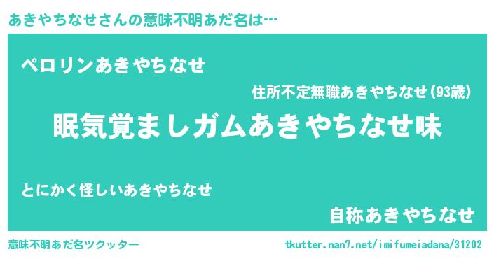 | 男性向けラノベタイトル風あだ名 | 『ノーゲーム・ノーアキヤチナセ』 |