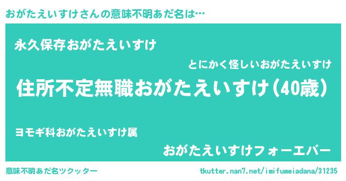 | 男性向けラノベタイトル風あだ名 | 『この素晴らしい世界におがたえいすけを!』 |