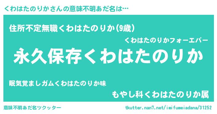 | 男性向けラノベタイトル風あだ名 | 『くわはたのりかという概念が存在しない退屈な世界 』 |