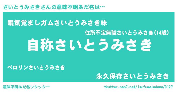 | 男性向けラノベタイトル風あだ名 | 『Re:さいとうみさきから始める異世界生活』 |