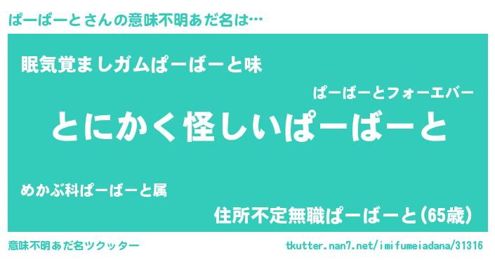 | 男性向けラノベタイトル風あだ名 | 『ぱーばーとの嫁は女の子じゃないと思った?』 |