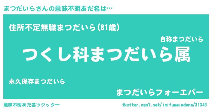 | 男性向けラノベタイトル風あだ名 | 『まつだいら~年齢イコール彼女いない歴の魔法使い~』 |