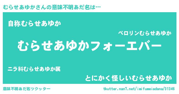 | 男性向けラノベタイトル風あだ名 | 『やはりむらせあゆかの青春ラブコメはまちがっている 』 |