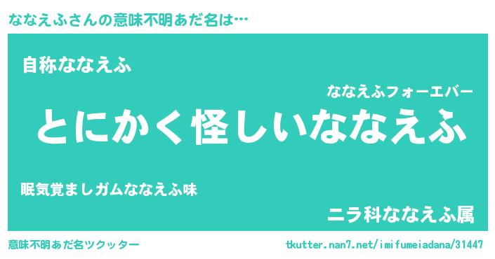 | 男性向けラノベタイトル風あだ名 | 『ななえふの嫁は女の子じゃないと思った?』 |