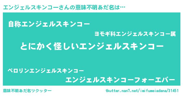 | 男性向けラノベタイトル風あだ名 | 『エンジェルスキンコーの嫁は女の子じゃないと思った?』 |