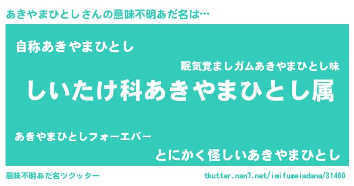 | 男性向けラノベタイトル風あだ名 | 『アキヤマヒトシスレイヤー』 |