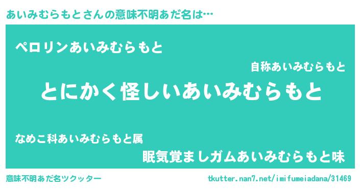 | 男性向けラノベタイトル風あだ名 | 『あいみむらもとの嫁は女の子じゃないと思った?』 |