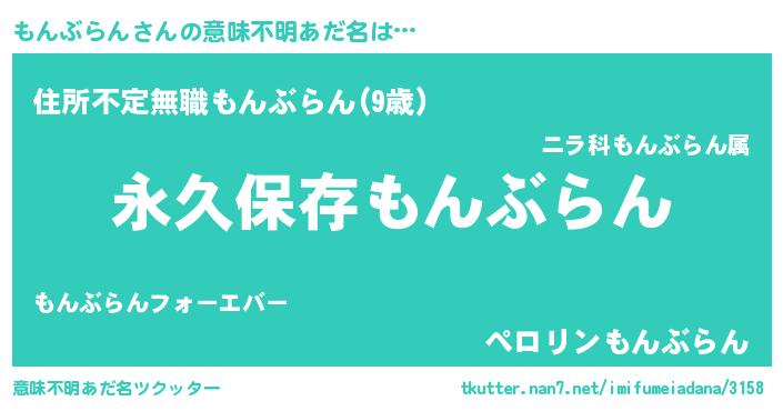 | 男性向けラノベタイトル風あだ名 | 『もんぶらんという概念が存在しない退屈な世界 』 |