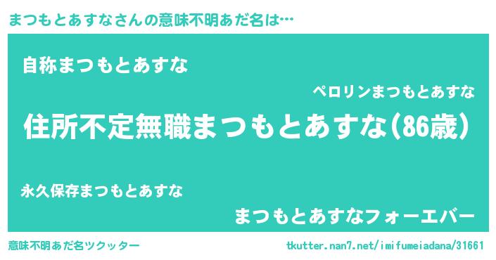 | 男性向けラノベタイトル風あだ名 | 『この素晴らしい世界にまつもとあすなを!』 |