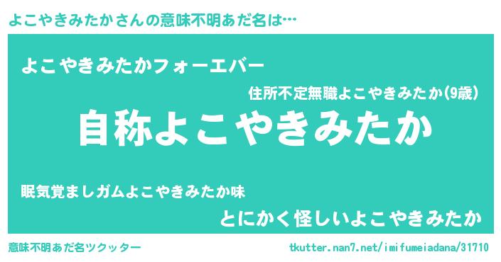 | 女子向けラノベタイトル風あだ名 | 『よこやきみたかなんてお断りですっ。』 |