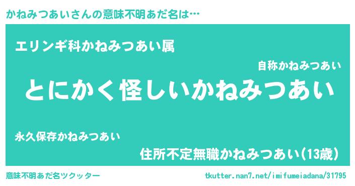| 胡散臭い通販商品みたいなあだ名 | 『信頼と実績のペンダント…その名も「かねみつあい」』 |