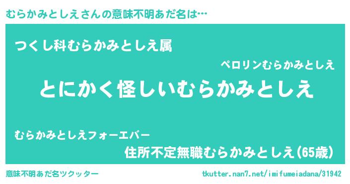 | 男性向けラノベタイトル風あだ名 | 『むらかみとしえの嫁は女の子じゃないと思った?』 |