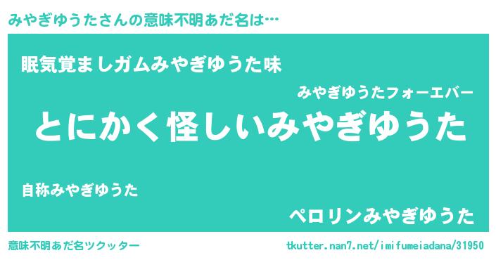 | 男性向けラノベタイトル風あだ名 | 『みやぎゆうたの嫁は女の子じゃないと思った?』 |