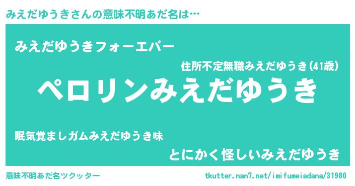 | 男性向けラノベタイトル風あだ名 | 『ミエダユウキアートオンライン』 |
