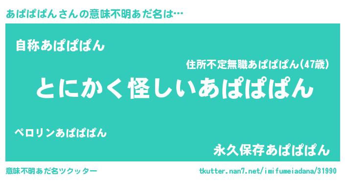 | ポケモン風あだ名 | 『ヒアパパパン』『アパセウス』 |
