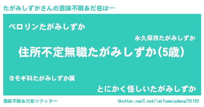 | 男性向けラノベタイトル風あだ名 | 『この素晴らしい世界にたがみしずかを!』 |