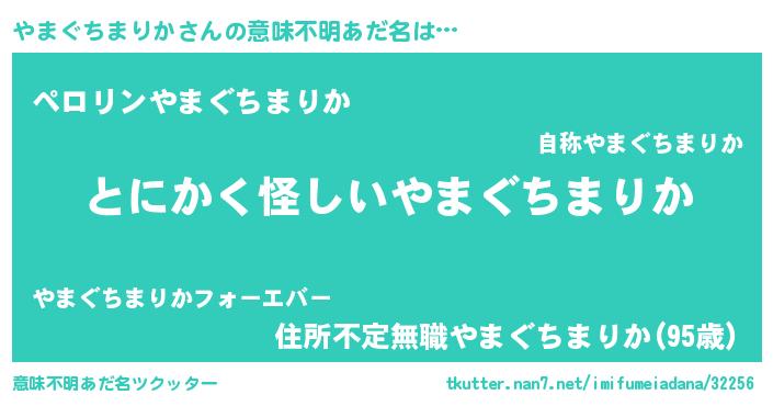 | 男性向けラノベタイトル風あだ名 | 『やまぐちまりかの嫁は女の子じゃないと思った?』 |