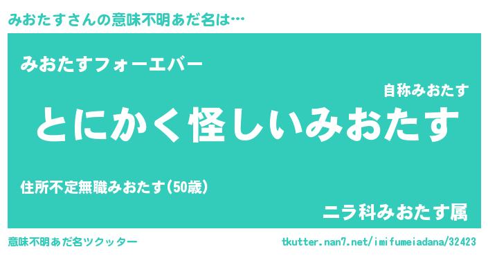 | 男性向けラノベタイトル風あだ名 | 『みおたすの嫁は女の子じゃないと思った?』 |