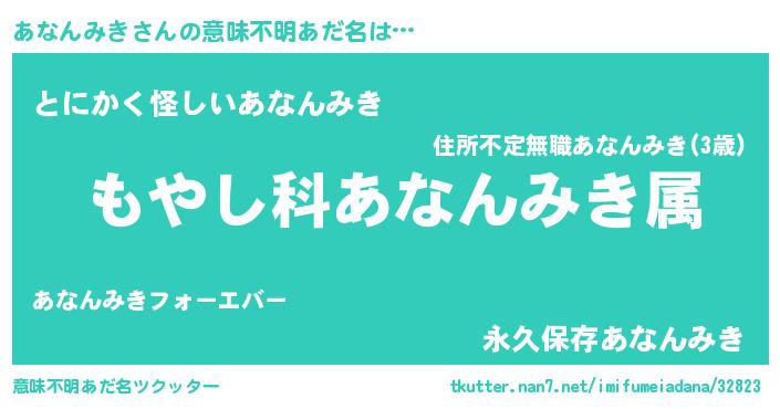 | 男性向けラノベタイトル風あだ名 | 『転生したらあなんみきだった件』 |