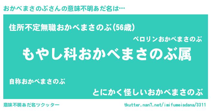 | 男性向けラノベタイトル風あだ名 | 『転生したらおかべまさのぶだった件』 |