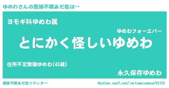 | 欧米人風あだ名 | 『アンジェラ・ゆめわ』『ウサインゆめわ』 |