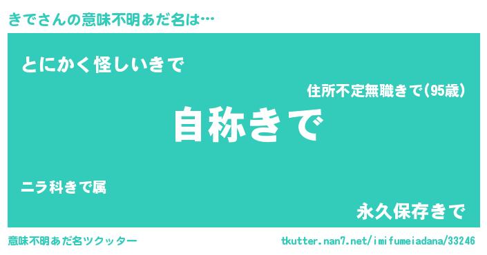 | 男性向けラノベタイトル風あだ名 | 『Re:きでから始める異世界生活』 |