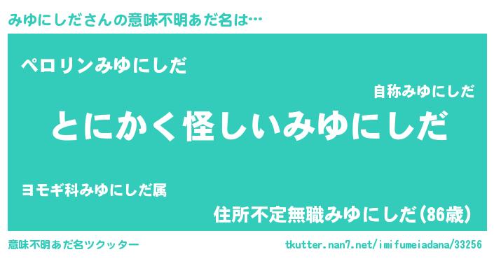 | 男性向けラノベタイトル風あだ名 | 『みゆにしだの嫁は女の子じゃないと思った?』 |